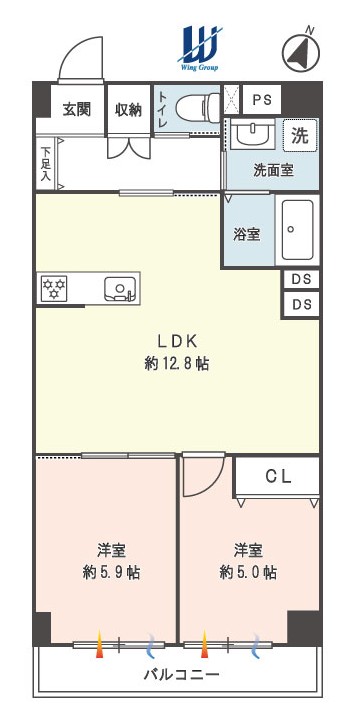 | 間取内容 | LDK 12.8帖・洋室 5.9帖・洋室 5.0帖 図面と現況が異なる場合は現況を優先します。 | ||