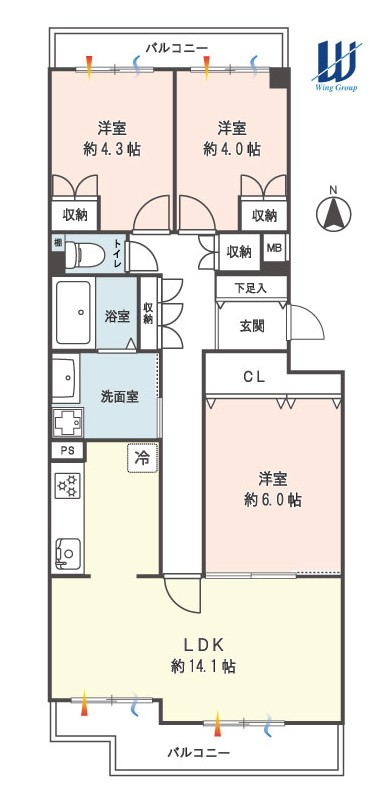 間取内容 | LDK 約14.1帖・洋室 約6.0帖・洋室 約4.3帖・洋室 約4.0帖 図面と現況が異なる場合は現況を優先します。 | ||