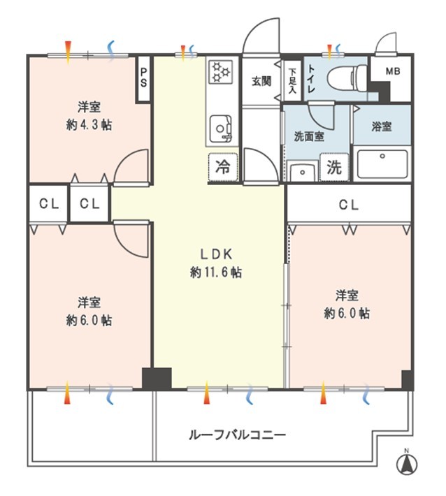 | 間取内容 | LDK 11.6帖・洋室 4.3帖・洋室 6.0帖・洋室 6.0帖 図面と現況が異なる場合は現況を優先します。 | ||