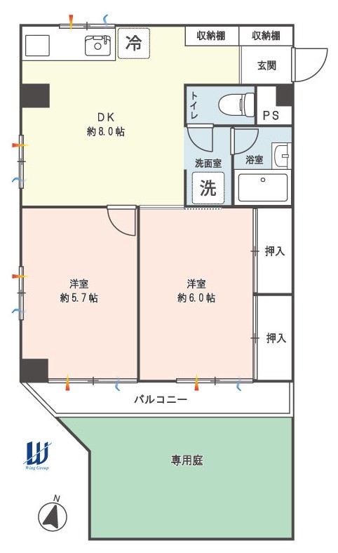 | 間取内容 | DK 8.0帖・洋室 5.7帖・洋室 6.0帖 図面と現況が異なる場合は現況を優先します。 | ||
