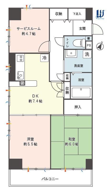 | 間取内容 | LDK 7.4帖・洋室 5.5帖・和室 6.0帖・サービスルーム 4.7帖 図面と現況が異なる場合は現況を優先します。 | ||