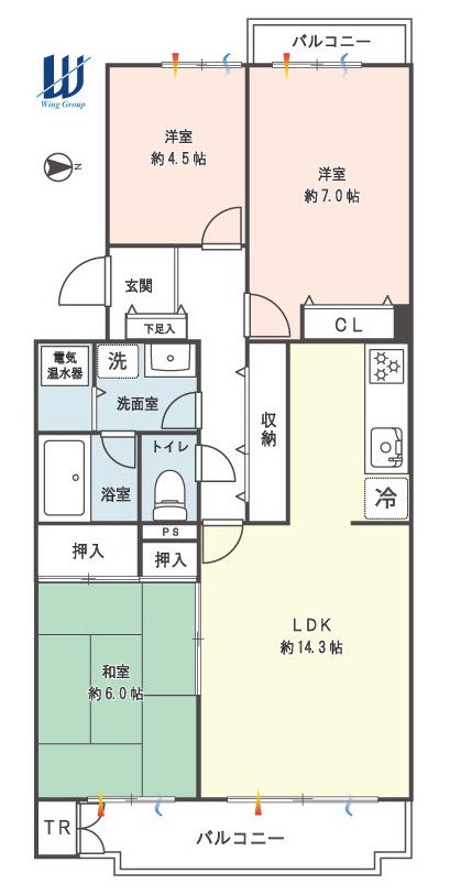 | 間取内容 | LDK 14.3帖・洋室 7.0帖・洋室 4.5帖・和室 6.0帖 図面と現況が異なる場合は現況を優先します。 | ||