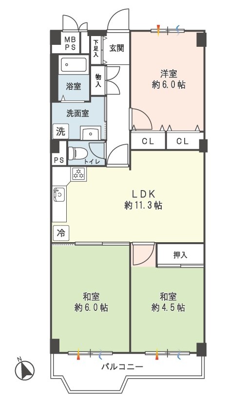 | 間取内容 | LDK約11.3畳・洋室約6.0畳・和室約6.0畳・和室約4.5畳 図面と現況が異なる場合は現況を優先します。 | ||