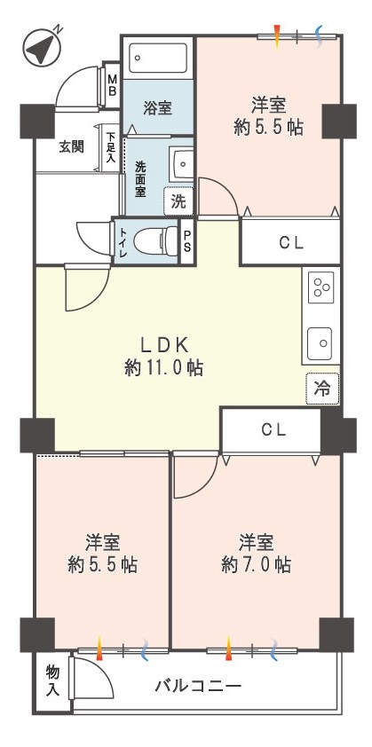 | 間取内容 | LDK 約11.0帖・洋室 約5.5帖・洋室 約7.0帖・洋室 約5.5帖 図面と現況が異なる場合は現況を優先します。 | ||