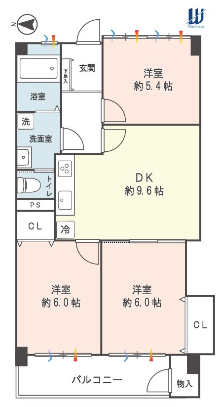 | 間取内容 | DK 約9.6帖・洋室 約5.4帖・洋室 約6.0帖・洋室 約6.0帖 図面と現況が異なる場合は現況を優先します。 | ||